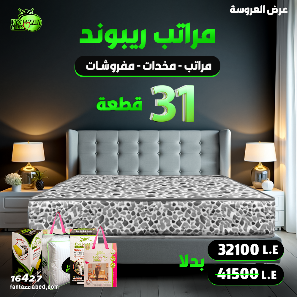 استمتعوا بصفقة استثنائية تضم 31 قطعة مختارة بعناية من منتجات فانتازيا، تشمل مراتب الريبوند  عالية الجودة، المخدات المريحة، والمفروشات الفندقية الفاخرة. تم تصميم هذه الباقة لتمنحكم أقصى درجات الراحة والدعم، مع مزيج مثالي من المتانة، الأناقة، والقيمة الاقتصادية. الحل الأمثل لتجهيز العرائس بلمسة راقية وصفقة واحدة متكاملة.